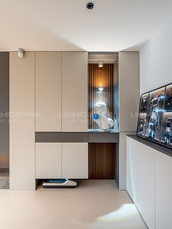 入戶鞋柜采用懸浮穿插設(shè)計(jì),更具設(shè)計(jì)感,搭配飾品使空間更生動(dòng)