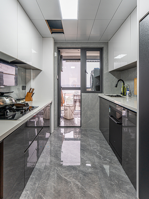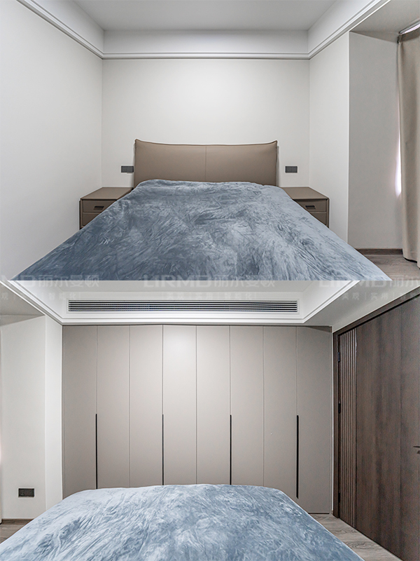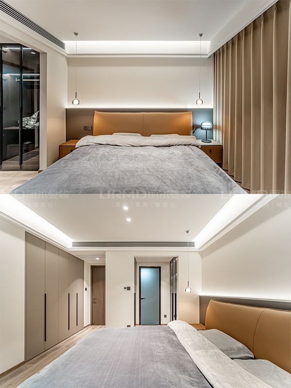 全屋門(mén)墻柜一體化定制,采用深咖棕+明亮淺灰的搭配,整體空間既不沉悶又更有層次感