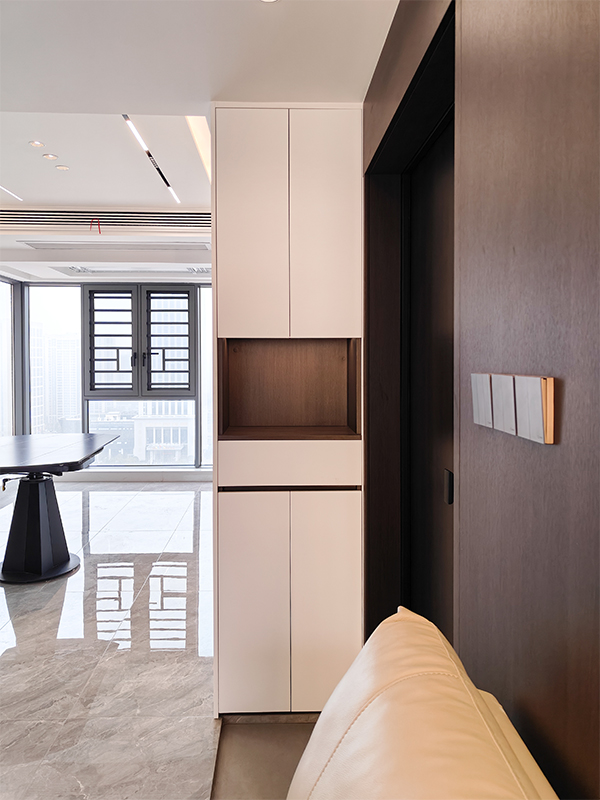 線條干凈利落,不僅給予屋主超好的觀影視線,也能將公區(qū)的零零碎碎裝入其中