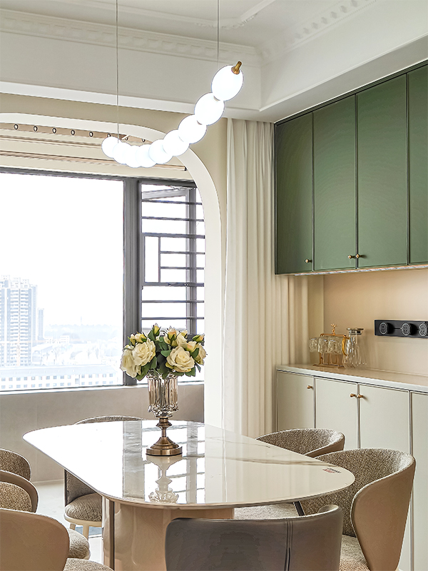 淡奶油色的墻面+地面木地板橄欖綠,跳脫出傳統(tǒng)現代法式的淺色單一元素,給法式的優(yōu)雅增添一份清新的美感