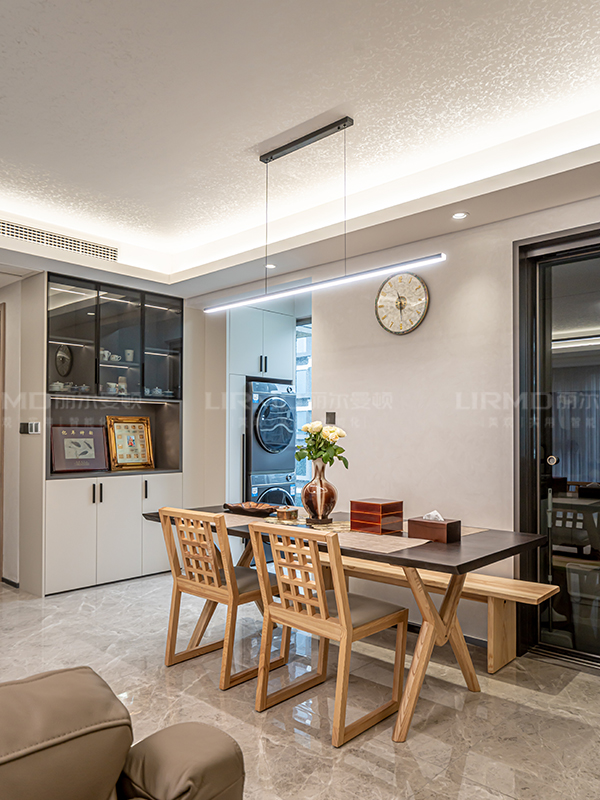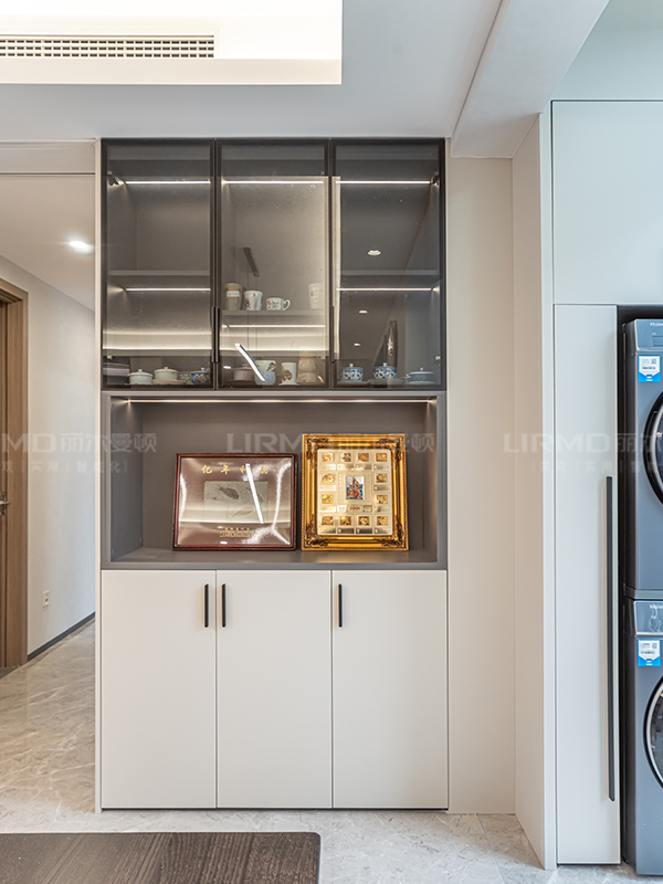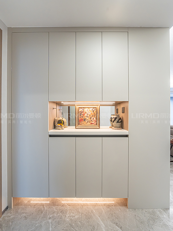 玄關(guān)加收納的轉(zhuǎn)角一體柜,銜接了玄關(guān)和客廳,讓整體空間更顯統(tǒng)一