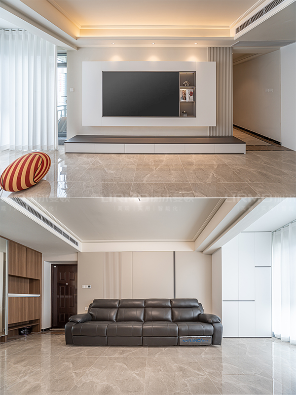 電視背景墻打破傳統(tǒng)形式,懸于半空,延伸出墻體之外,為空間帶來(lái)更多的自由和開(kāi)放感