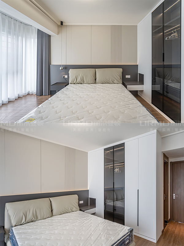 床頭做轉(zhuǎn)角置物柜式床頭柜,懸空不落地,搭配玻璃柜門(mén)一門(mén)到頂衣柜,一柜搞定置物和收納