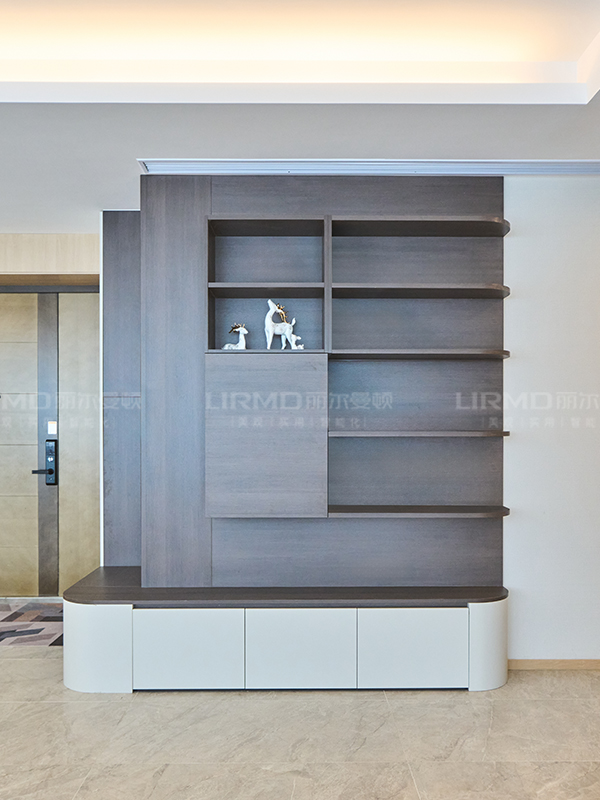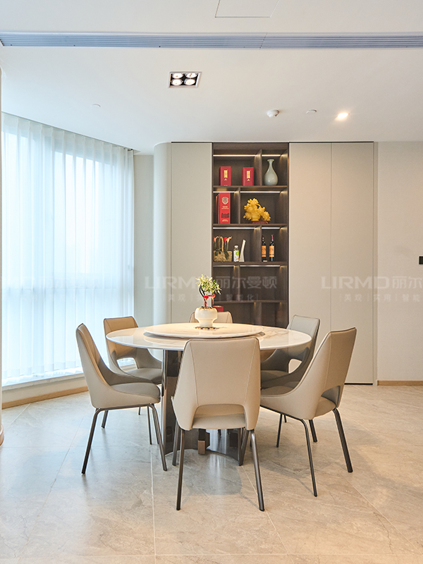 從視覺上更加符合居住環(huán)境,特意打造整墻餐邊柜,收納展示柜,轉(zhuǎn)墻多功能一體柜