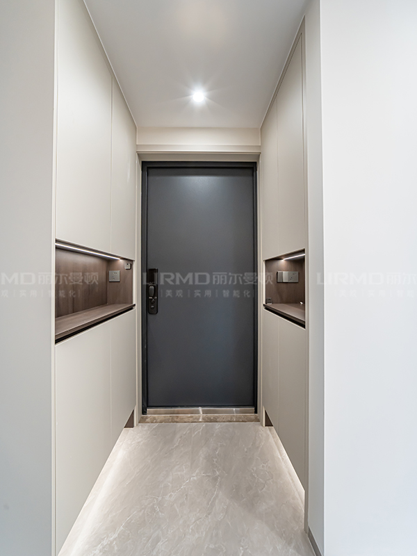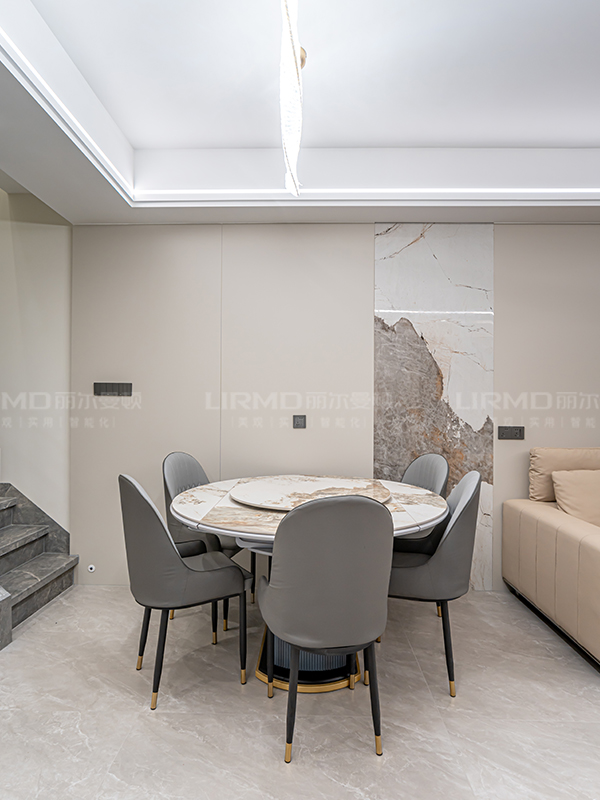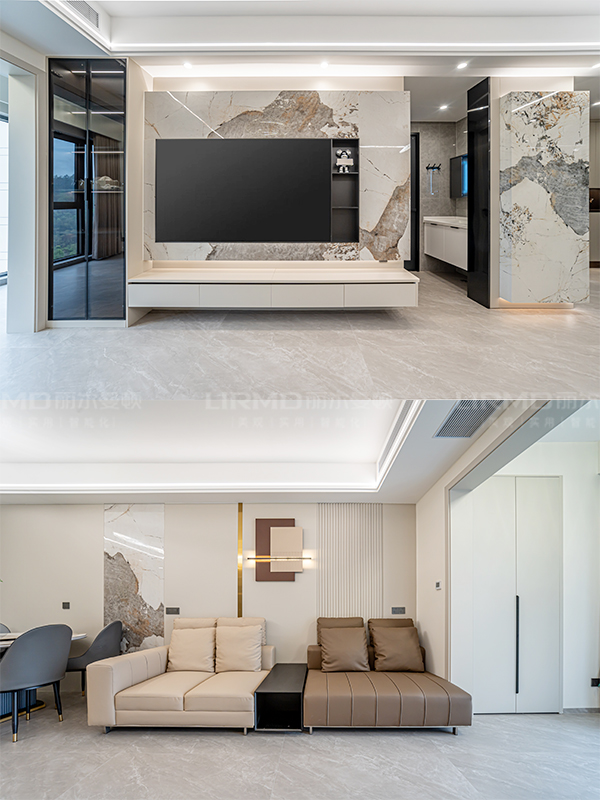 嵌入式轉墻冰箱柜、玄關疊級造型、潘多拉巖板上墻,電視背景墻以及整墻配套同色沙發(fā)背景