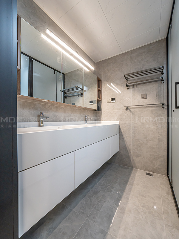 疊級雙眼皮吊頂、無縫亞克力雙盆一體、書桌、書架、收納柜三合一一體柜還有回形滿墻衣柜
