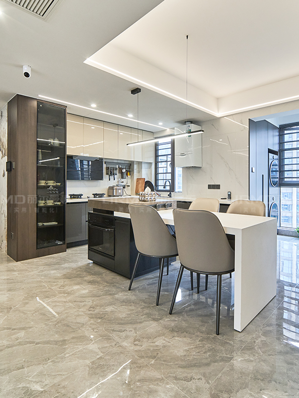 聯(lián)通廚房+餐廳+生活陽臺,增加客廳的寬廣度和互動性,視覺感官上形成超大平層既視感