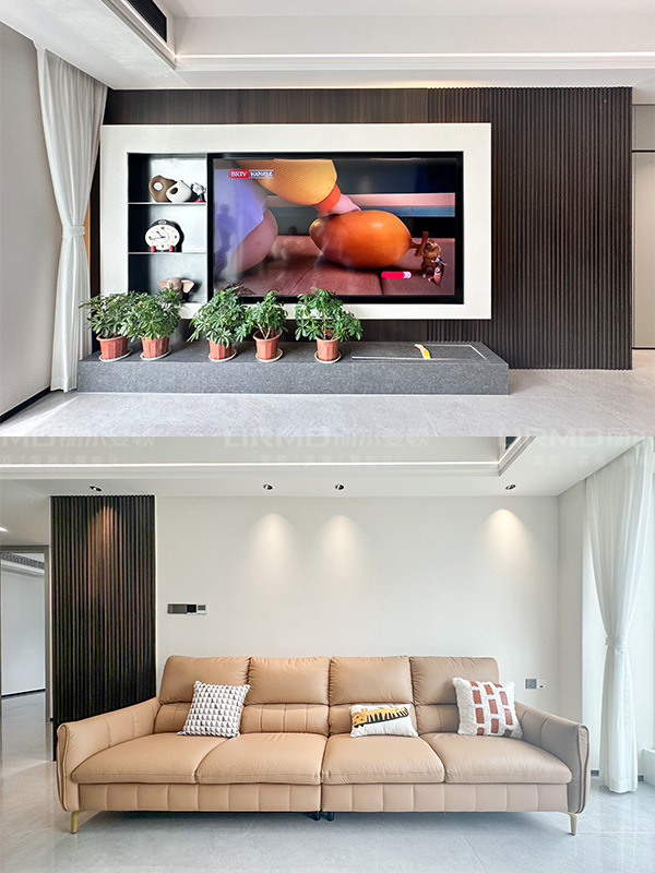 電視背景采用懸浮設(shè)計(jì),利用格柵護(hù)墻與巖板的搭配,清晰明了的線(xiàn)條,簡(jiǎn)單大氣