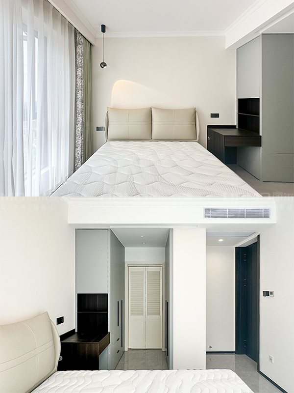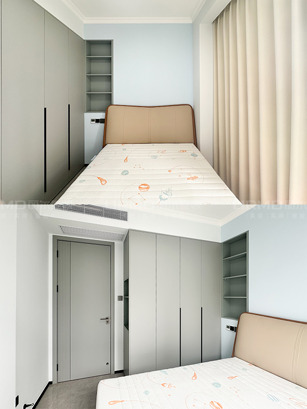 利用格柵隱形門(mén)與同色系的木飾面定制,增大電視墻的視覺(jué)效果,提高美感擴(kuò)大空間