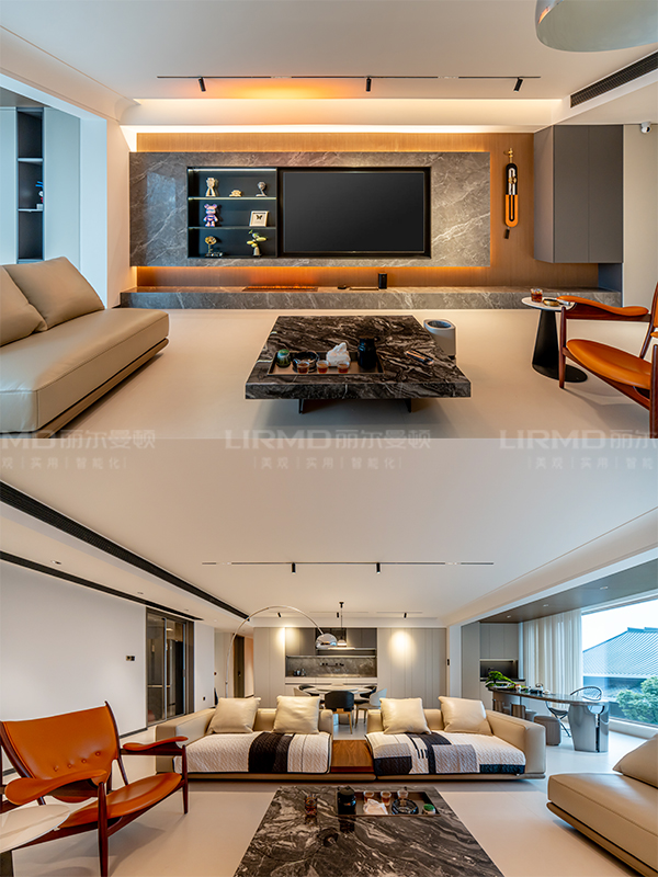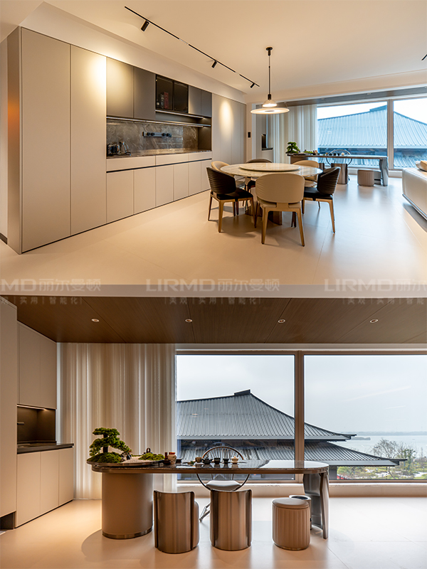 客餐廳空間開闊大氣,木飾面巖板背景墻搭配無拉手柜門又美觀又實(shí)用