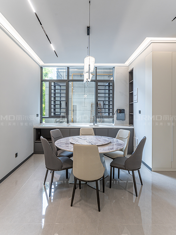 客廳以白色為主,采用開放式布局,餐桌和餐椅線條流暢,色彩統(tǒng)一簡約的線條空間感滿滿