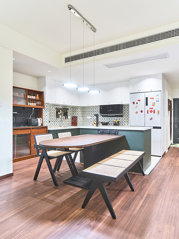 放置一張島臺(tái)餐桌,屹立中央,操作臺(tái)做L型設(shè)計(jì),動(dòng)線(xiàn)合理,操作流暢