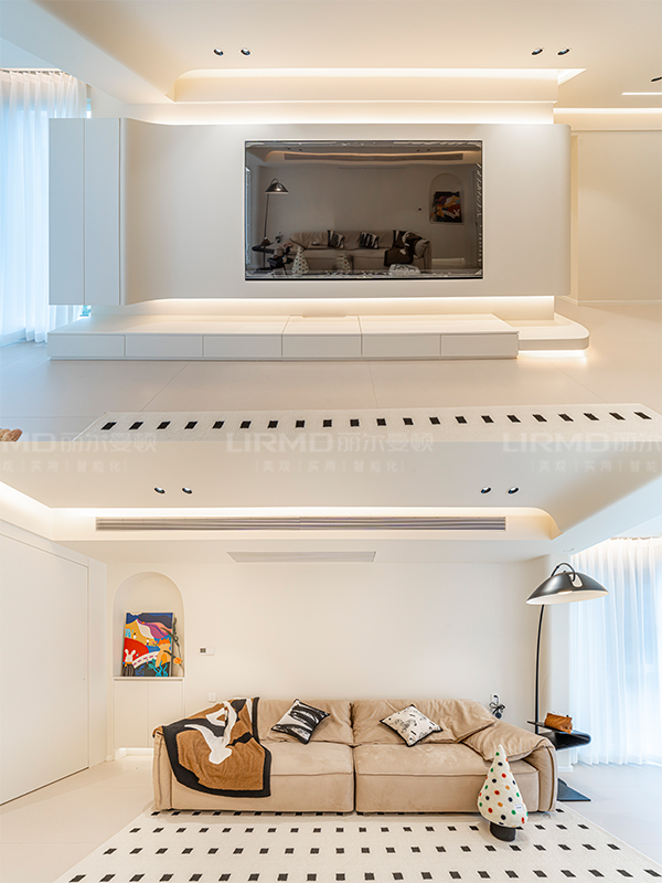 全屋做回形無主燈吊頂,延伸感拉滿的圓弧曲線大轉(zhuǎn)角端景