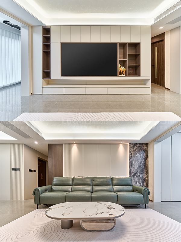 電視柜做嵌入式,收納和開放格結(jié)合。沙發(fā)背景墻格柵+威尼斯棕花色結(jié)合,簡約不失設計感